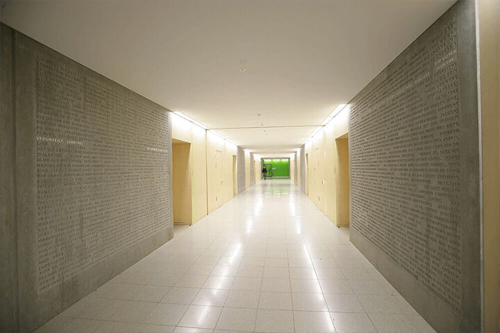 Historische Literaturzitate, besondere Geschichtsdaten und weltverändernde Formeln sind in jedem Flur durch die Lütkenhaus Betonwände für die Ewigkeit festgehalten.