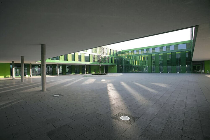 Kultur und Natur verbinden sich in den Innenfluren auf ca. 80 Sichtbetonelementen, welche abwechselnd und doch in gelungener Verbindung zu den natürlichen Holzverkleidungen stehen.
